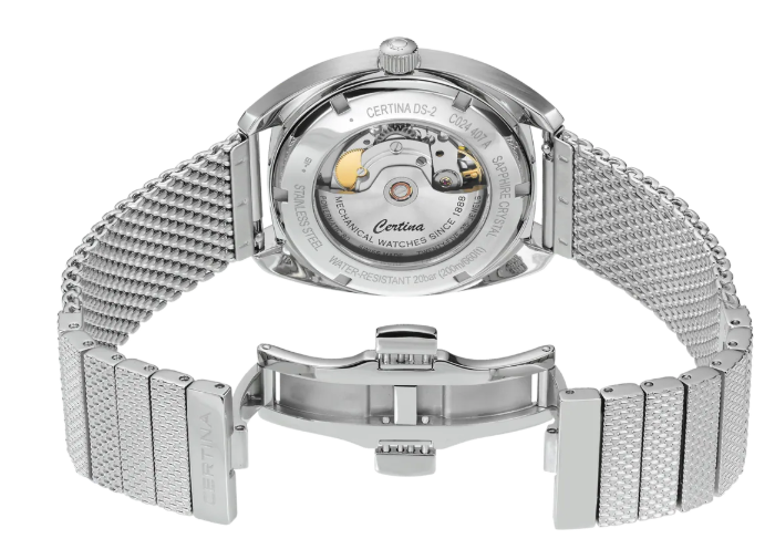 Эта история включает множество имен и дат, определивших ее ход. Летопись швейцарской часовой марки Certina отмечает 1968-й год следующей значительной вехой: в этом году модель DS-2 задала новые стандарты надежности в часовом искусстве. Сегодня эффектный стиль 60-х переживает второе рождение в современном автоматическом калибре с пружиной NivachronTM, обладающей антимагнитными свойствами. Вес нетто: 140 гр. Для корпуса, браслетов и застежек своих часов марка Certina использует нержавеющую сталь 316L, отличающуюся повышенной износостойкостью, устойчивостью к коррозии и гигиеничностью. В стали содержится совсем небольшое количество никеля, поэтому этот материал не вызывает аллергии при носке. Стекло: одностороннее антибликовое покрытие на сапфировом стекле. Сапфировое стекло состоит из порошка оксида алюминия (Al2O3), раскаленного до 2.000 C. Получаемые в результате сапфировые пласты нарезаются на тонкие пластины, им придают требуемую форму и полируют. Сапфир абсолютно прозрачен, обладает высокой устойчивостью к царапинам и механическим повреждениям. По этим причинам сапфировое стекло стало неотъемлемой деталью концепции DS и используется во всех моделях Certina для защиты циферблата. Водонепроницаемость 20 бар (200 м). Длина корпуса 38 мм, ширина 40 мм, толщина 12.65 мм. Размер браслета у корпуса 20 мм. Покрытие Superluminova на циферблате. Super-LumiNova (SLN) представляет собой cветящийся материал с фосфоресцирующими свойствами. В темноте SLN типа BG W9, который использует Certina, испускает свет в виде голубого мерцания. SLN не вредит здоровью и используется для нанесения на стрелки, индексы и безели. В темноте он через некоторое время теряет свои фосфоресцирующие свойства, но они автоматически восстанавливаются на свету. POWERMATIC 80.611 ETA с запасом хода 80 часов и сплавом Nivachron. (Спирали баланса созданы из инновационного титанового сплава. Этот революционный материал был создан при сотрудничестве с компанией Swatch Group и используется лишь ограниченным числом брендов. Пружины Nivachron обладают повышенной устойчивостью к воздействию электромагнитных полей, ударам, старению материалов, экстремальному перепаду температур, выводят часы на совершенно новый уровень точности и обеспечивают долговечность аксессуара.)
