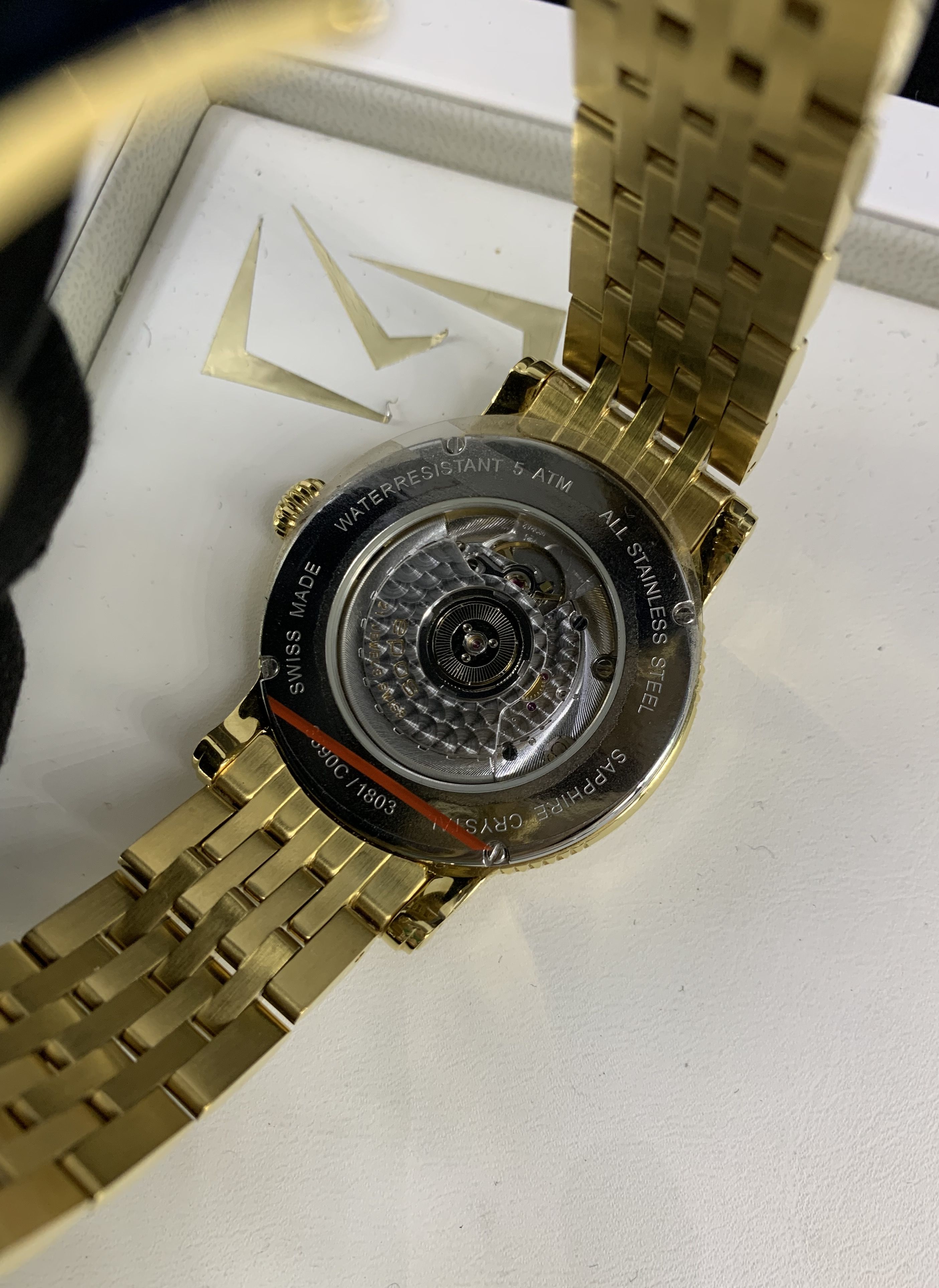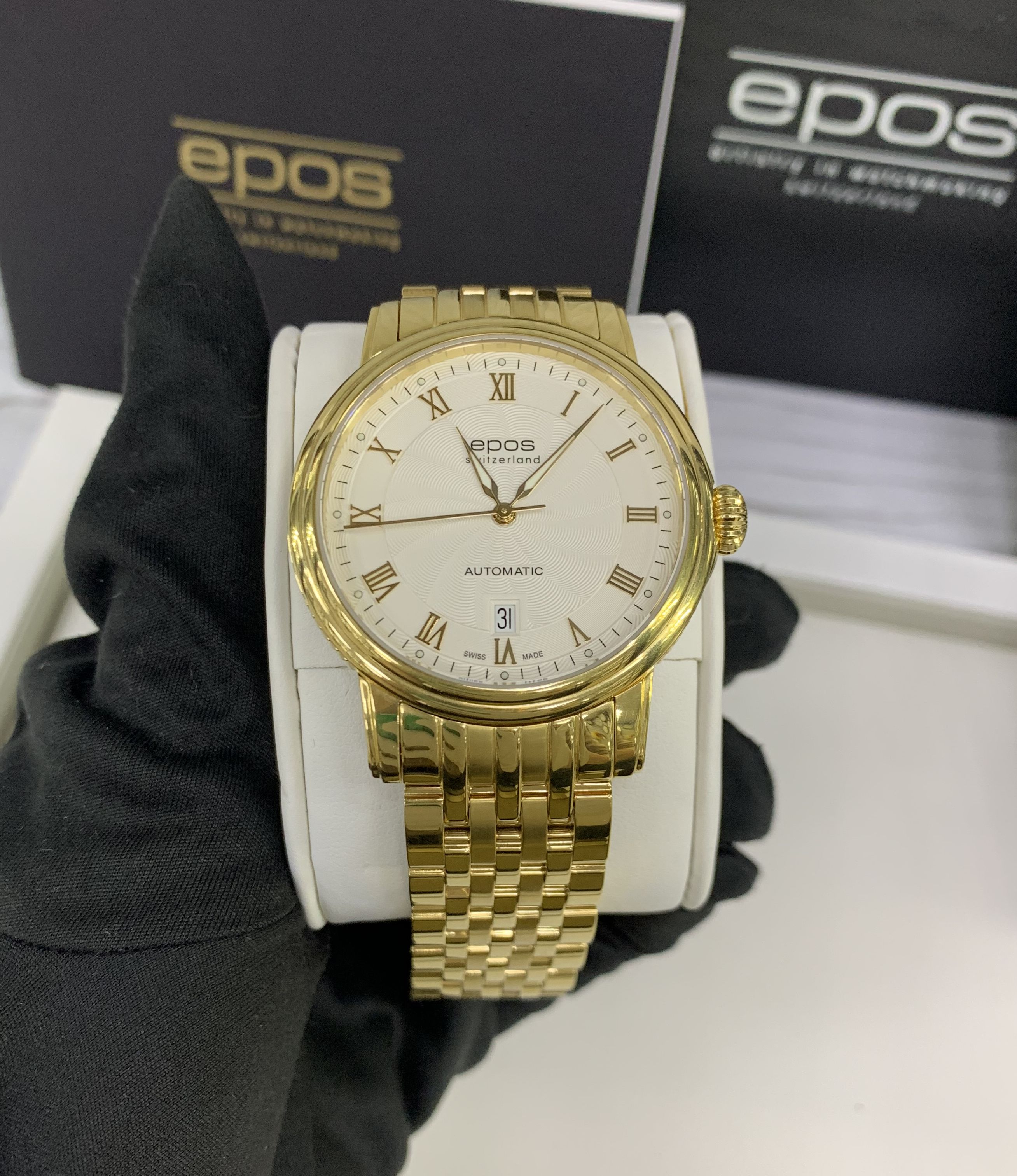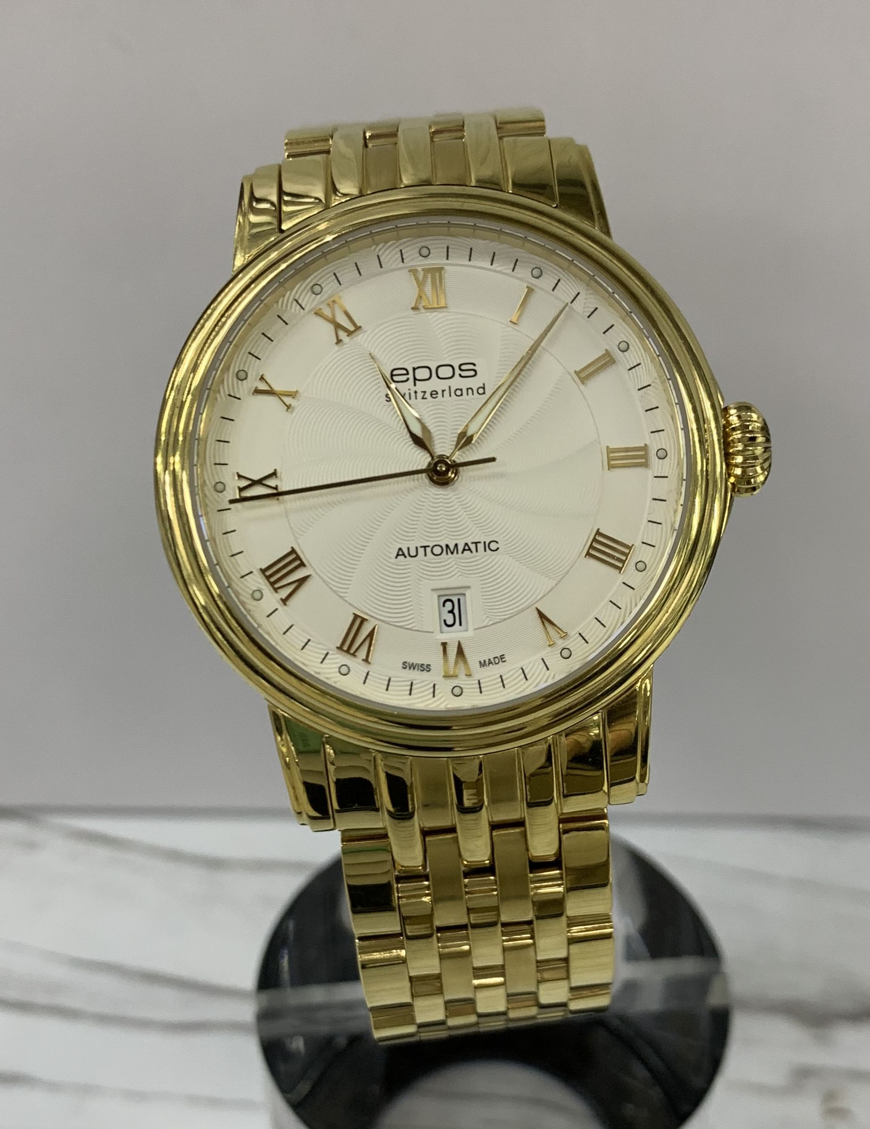 Швейцарские механические мужские наручные часы с автоподзаводом Epos 3390.152.22.20.32 на золотом стальном браслете с PVD покрытием. Корпус часов также выполнен из нержавеющей стали. Циферблат круглой формы, белого цвета. Сапфировое стекло по прочности, уступающее только алмазу. Водозащита часов 50 метров. Окно даты.